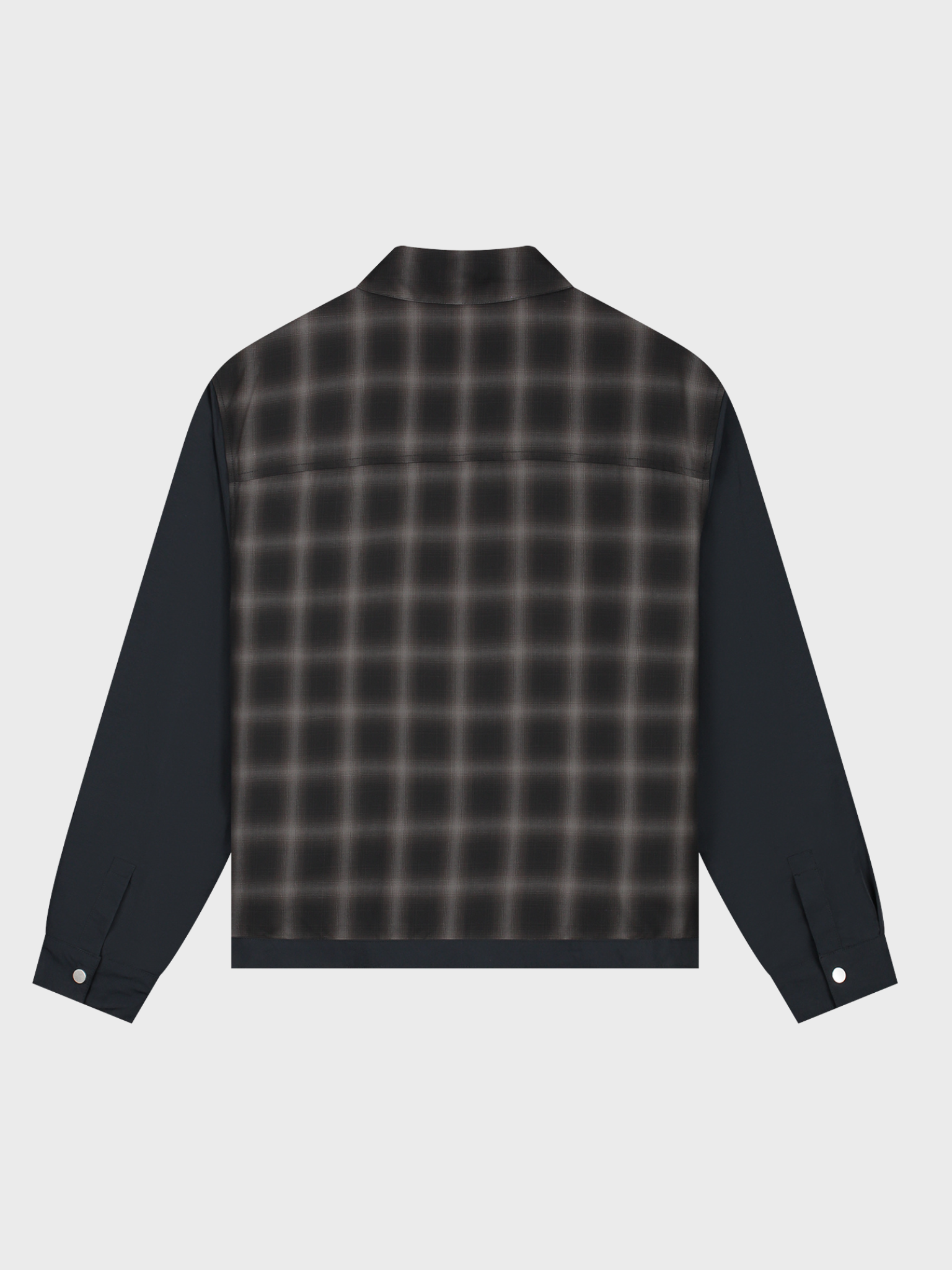 The jacket offers a distinctive look by combining nylon sleeves with a body in a plaid pattern. The jacket is detailed with side pockets and a full-length zipper.