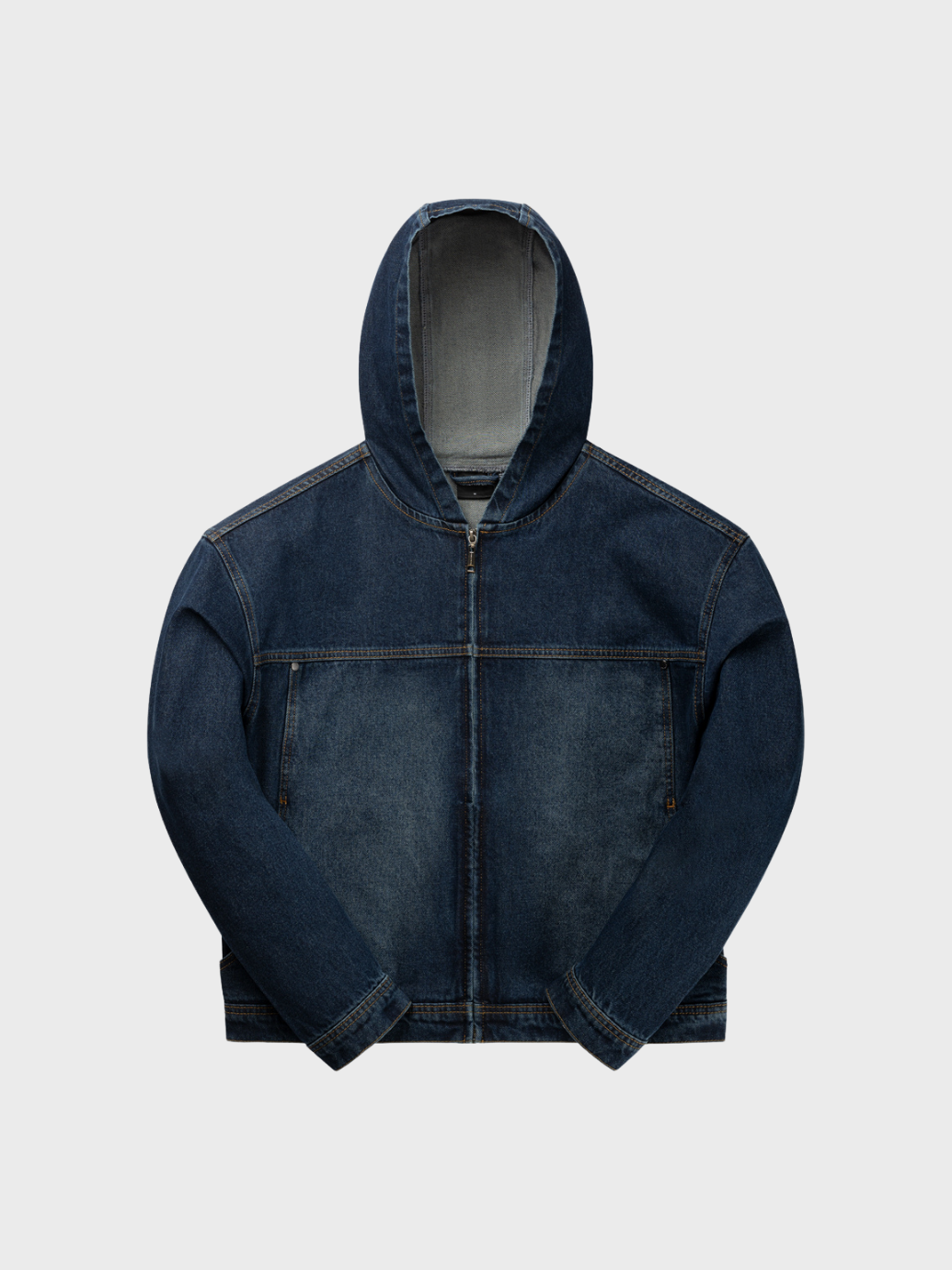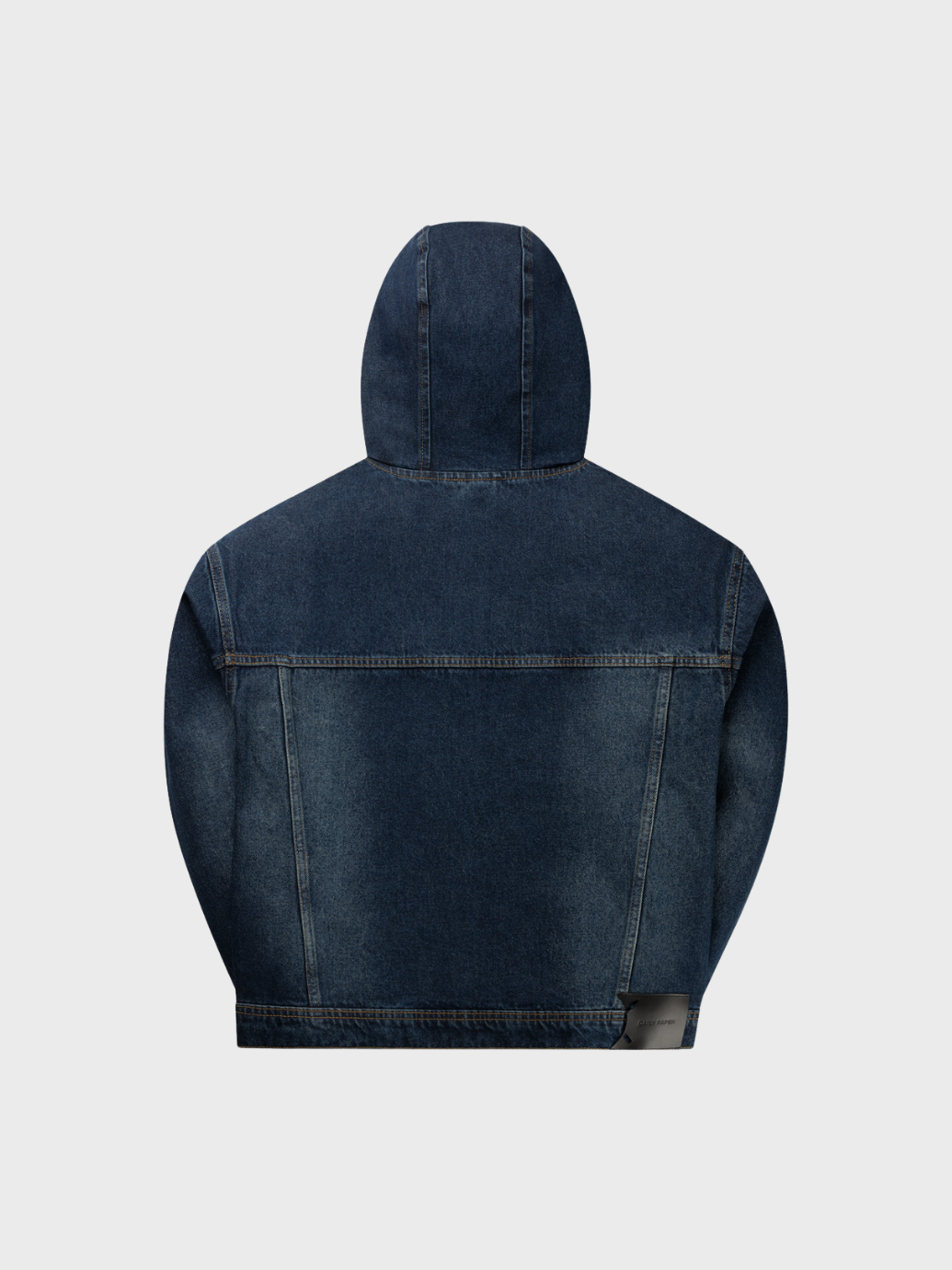 hooded Indigo washed denim jacket is made from a blue denim fabric with spray effect. The oversized silhouette with front and back yoke comes with a visible zip closure and in-seam pockets. A faux leather patch is placed at the back of the bottom hem. Pair with the matching Indigo washed jeans for a complete look.