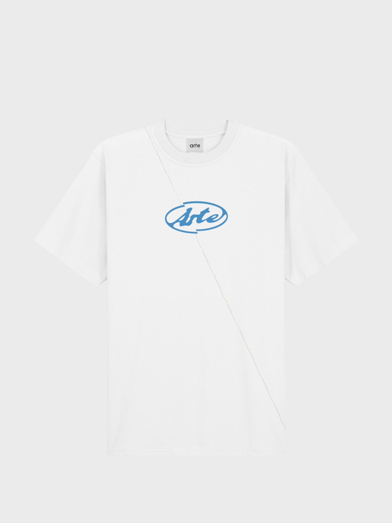 The T-shirt features a seasonal Arte logo screen-printed in blue across the chest. The graphic is divided by a seam that runs diagonally across the T-shirt, channeling the theme of the collection. Made from premium heavyweight cotton, the navy T-shirt has a slightly higher neck and a relaxed fit.